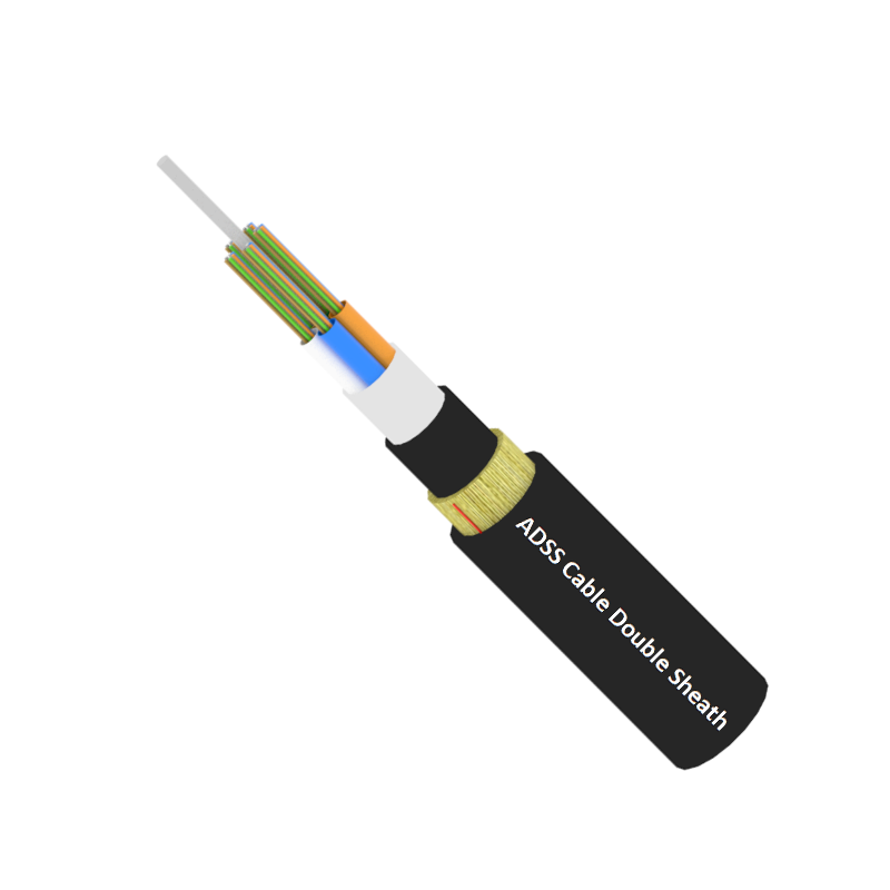 This ADSS Cable Double Sheath does not require supporting structures such as steel cables or pipes, and can be directly hung on power facilities such as utility poles and light poles. The structural feature is that the 250µm optical fiber is wrapped in a loose tube made of PBT, which contains a filling compound. The center of the optical cable is a fiber reinforced plastic (FRP) central reinforcement member to increase the strength of the optical cable. The water-blocking layer includes water-blocking yarn and water-blocking tape. Dtex aramid is used on the inside of the outer sheath, and the optical cable is equipped with 2 Ripcords. The double outer sheaths are  PE jacket or AT jacket.