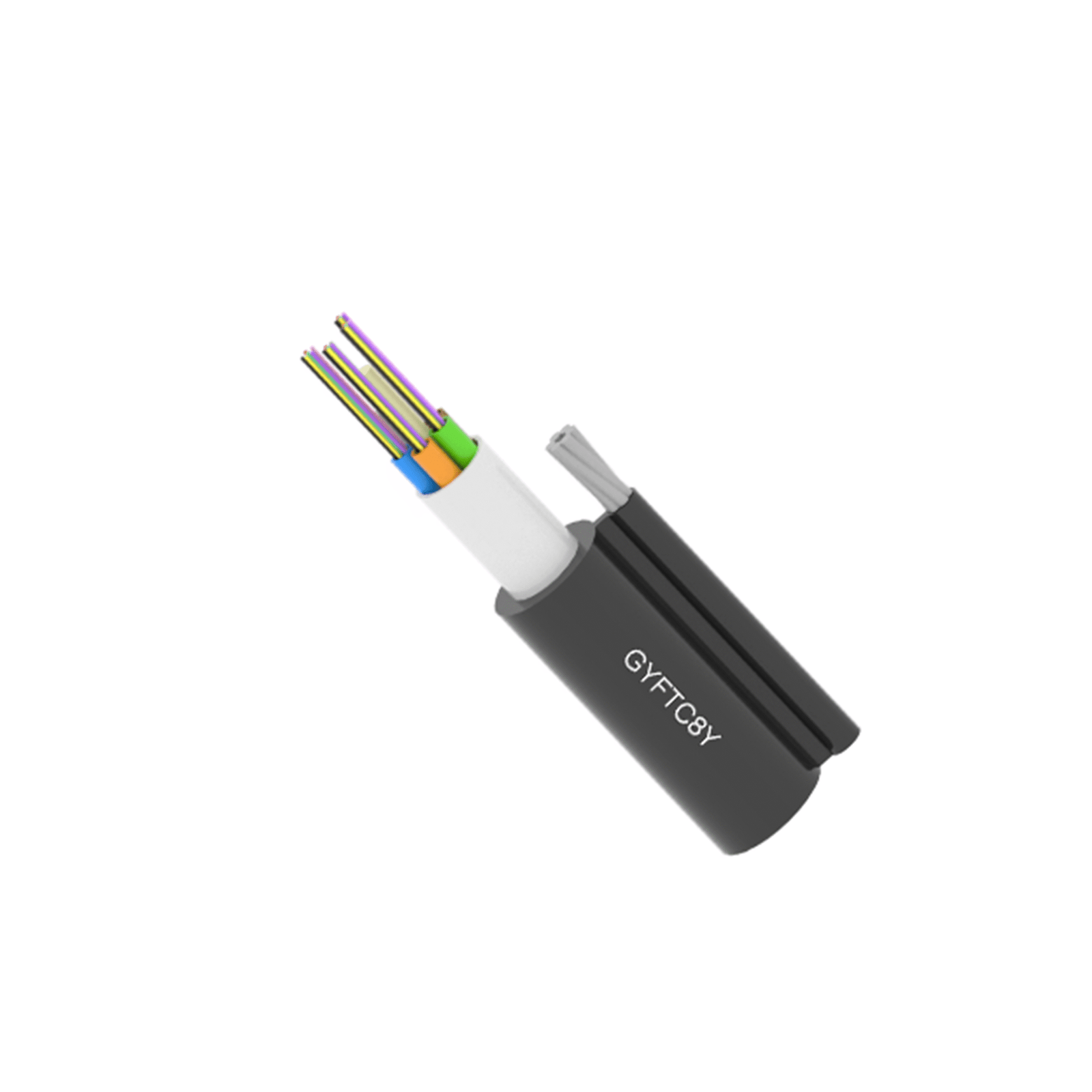 GYFTC8Y is a figure-8 optical fiber cable which is constructed with a central FRP for strength. Surrounding this core is a bundle of loose tubes made from high-modulus plastic. Each tube houses multiple 250µm optical fibers and is filled with a water-resistant compound .These tubes are then stranded around the central strength member to form a compact, circular cable core and wrapped in the water blocking tape. Finally, stranded wires are incorporated for support, and the entire assembly is encased in a polyethylene (PE) sheath, resulting in the distinctive figure-8 shape.