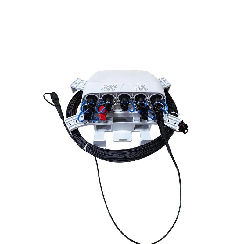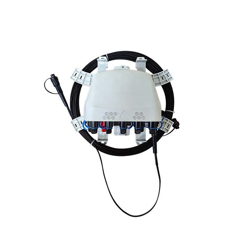 The SFTB-11A is an indoor/outdoor fiber optic distribution box designed for FTTH (Fiber to the Home) applications. It serves as a termination point for feeder cables to connect with drop cables, facilitating fiber splicing, splitting, and distribution. This box is suitable for wall or pole mounting and is equipped with waterproof fast connectors, ensuring reliable performance in various environmental conditions.