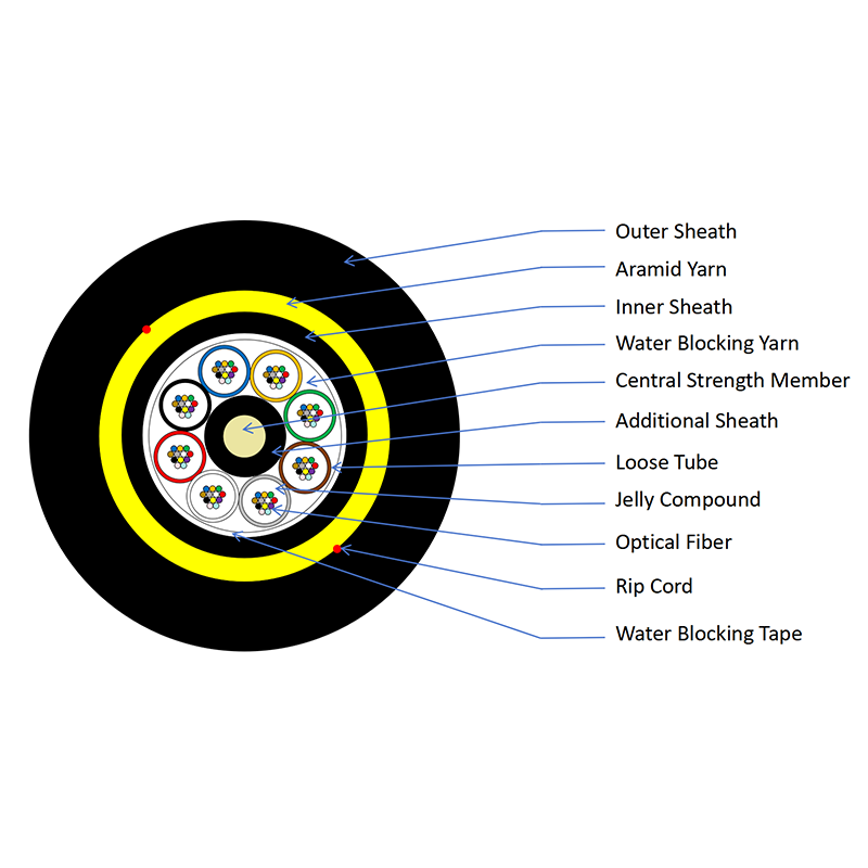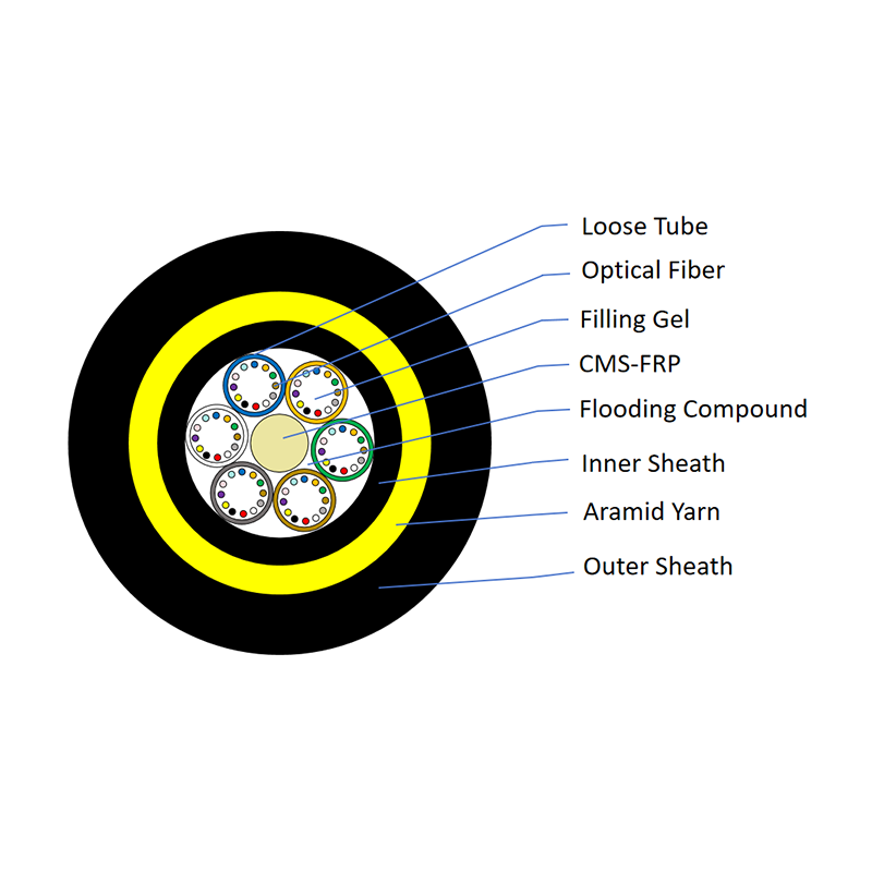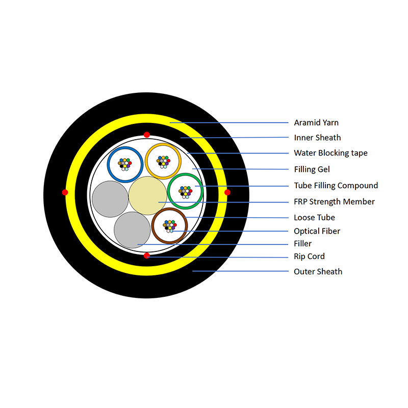 The structural features of this ASU cable are 250µm optical fiber encased in a loose tube made of PBT, which contains a filling compound, and the cable contains two fiber reinforced plastic (FRP) center strength members to increase the strength of the cable. Finally, the polyethylene (PE) outer sheath wraps the cable to increase its durability.