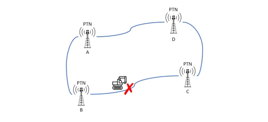 First of all, in order to build base stations for convenience, maintainability, and safety, base station construction needs to be built according to the ring networking structure. As shown in the figure, there are 4 Macro Sites (A, B, C, D) with PTN equipment installed, and a ring connection is formed through Fiber Optic Cable. During construction, the Fiber Optic Cable between base stations B and C was dug up, but this will not affect signal transmission, because the base station signal transmission of the ring network connection is bidirectional, and B can transmit the signal to C through A-D. The final signal will be sent to the Aggregation Data Center, and the Aggregation Data Center will transmit the data to the Aggregation Data Center farther away to achieve cross-city data transmission.