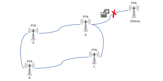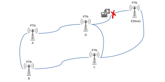 At this point, the newly built base station belongs to a branch in the ring network of these 4 Macro Sites. There is a great risk in the Base Station Branch. If the Fiber Optic Cable is broken, this base station will have the risk of Station Drop. When users make calls near this base station, they may find that the mobile phone signal is full, but the call cannot be made. The full signal represents the signal connected to the base station antenna. The RRU and BBU have processed the signal and transmitted the data to the PTN. Since the Fiber Optic Cable is broken, the PTN transmission data cannot be delivered to the next base station, and the data cannot enter the Aggregation Data Center, and the signal data cannot be sent to the target location until the Fiber Optic Cable is re-welded.